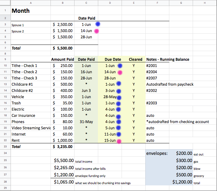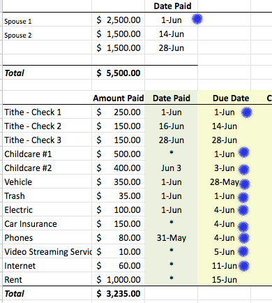 Now, you’ll notice the blue dots. This indicates what Spouse 1’s check will cover. They are paid monthly so their check is larger and can cover more expenses. If you total up what that check will cover, that is most of the bills and totals $1,935, leaving $565 left over.