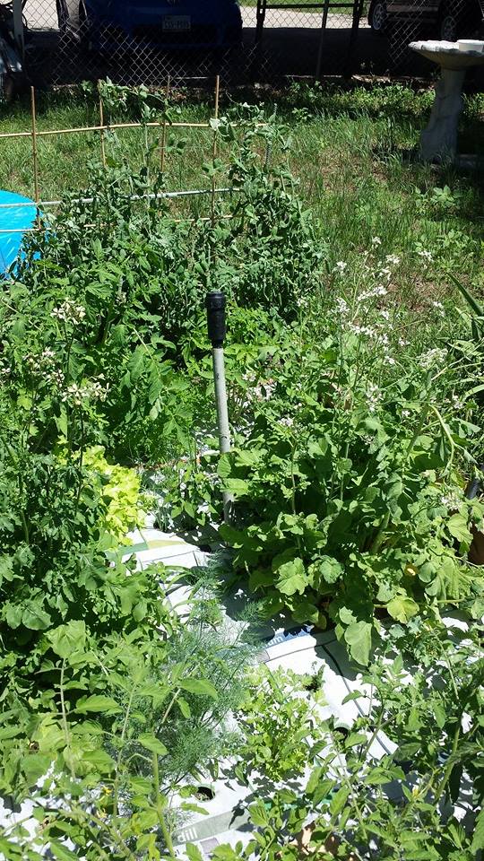 Overall, the idea was pretty fun and my then-three-year-old really enjoyed the gardening experience, helping mom and dad find yet another squash hiding in the leaves or tomatoes to roll gently into a bowl. We added more plants around the space beyond the Nourishmat without any grand design scheme in mind. See the plant? Like the plant? Buy the plant and put it somewhere! When we put fencing up to protect the garden from the dog, I thought it would be a great idea to put a tomato plant near the gate. That was not a smart decision. Let me share with you the story about the time that I briefly thought we had urine coming out of the bathroom sink. It relates to the tomatoes, I promise.