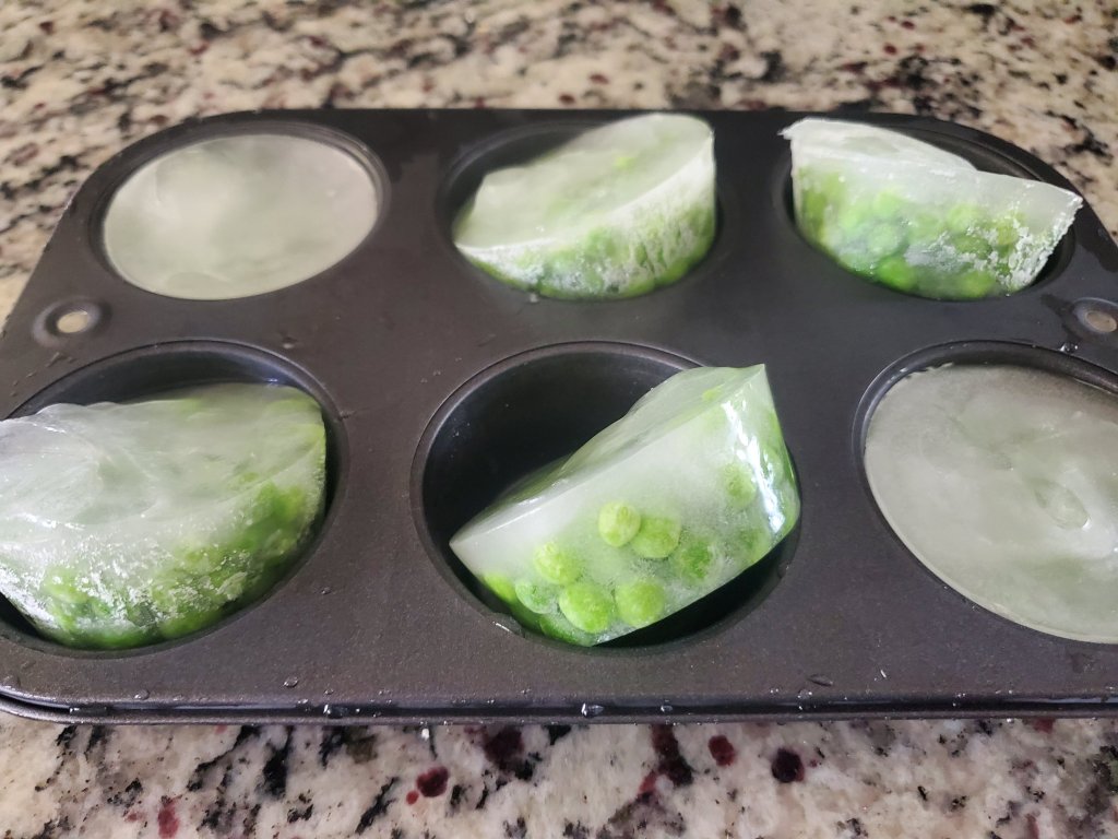I grabbed a small muffin pan, filled the cups 2/3 of the way with water and added frozen peas. I set the tray in the freezer and waited overnight.